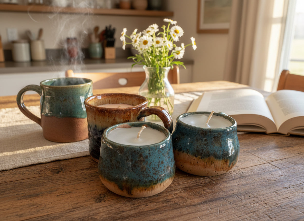Light up your space with our hand poured rustic candles in unique wheel thrown vessels. Made for those sensitive to smells, these scentless candles are perfect for adding a touch of warmth and charm to any room. Handmade with love and care, each candle is a beautiful addition to your home. Choose from the mug or one of the other two designs similar in shape and color.